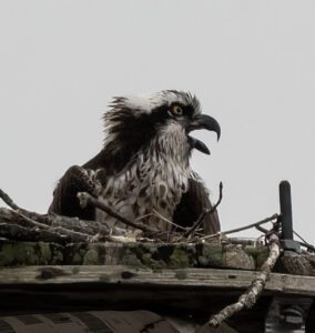 AN OSPREY GAURDS her nest at Shelburne Bay, watching a grey day drift by from on top of her nest. Photo by Dottie Nelson