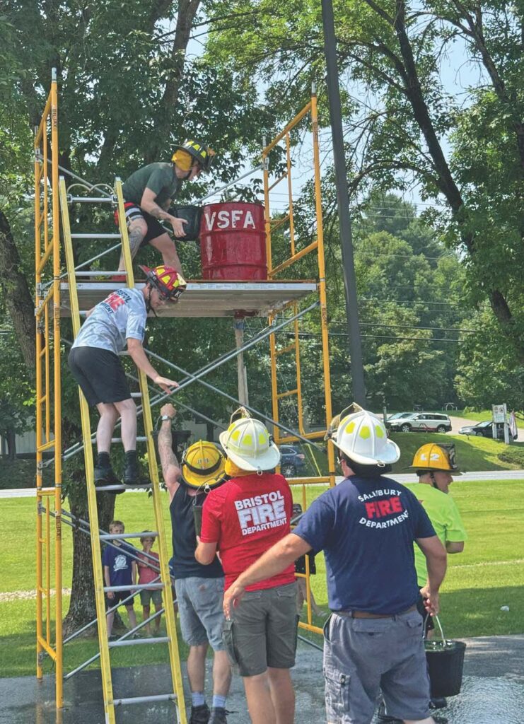 - JUST LIKE IN a real emergency, a group of Addison County firefighters works together during the bucket brigade competition at Saturday’s Muster Games to accomplish a task. The games reinforce skills but also build camaraderie among firefighters from different departments. Independent photo/Caroline Jiao