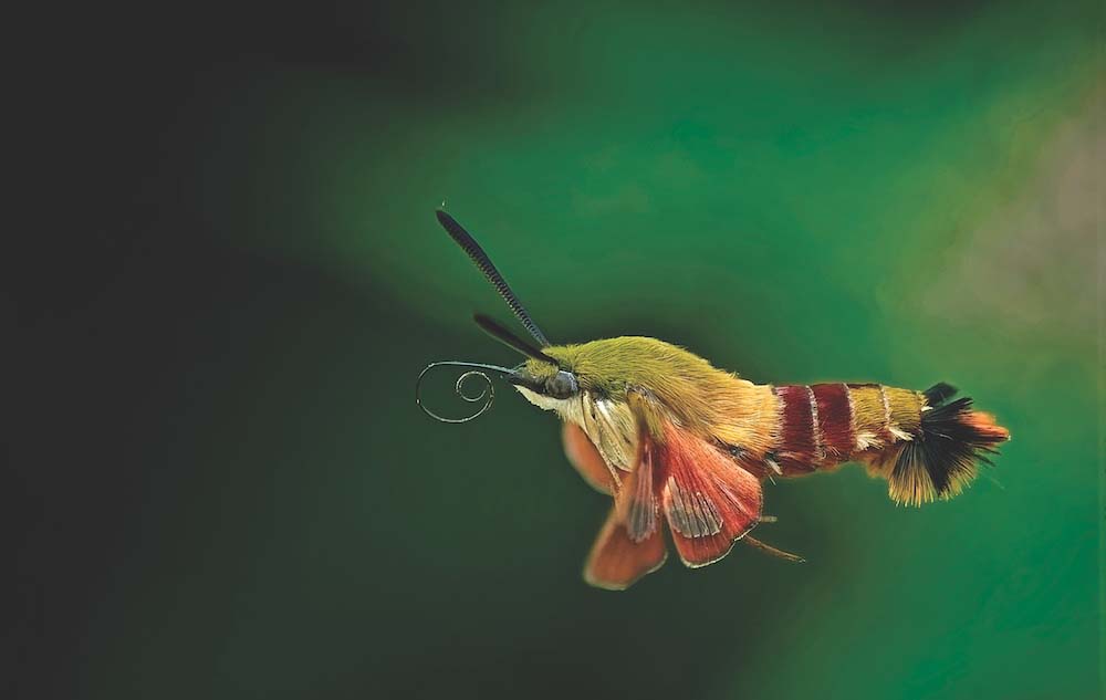 - A HUMMINGBIRD CLEARWING moth hovers near some Joe Pie Weed, about to take a sip of nectar. Photo by Dale Cockrell
