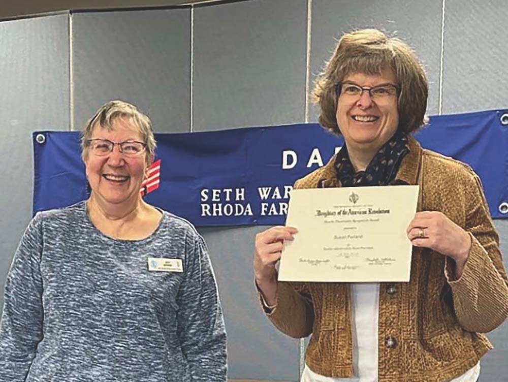 - SUSAN FERLAND OF Vergennes, right, received the NSDAR Historic Preservation Recognition Award on Feb. 10 for her numerous contributions to historic preservation projects in Addison County. With her is Joy Minns of the Seth Warner – Rhoda Farrand Chapter of the DAR. Courtesy photo