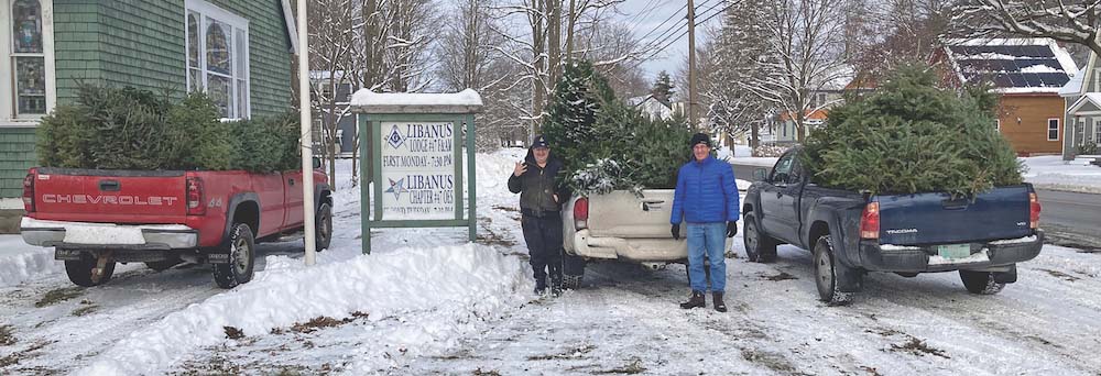 - BRISTOL MASONS MIKE Brown, right, and Matt Moyer volunteered to pick up Christmas trees in the village of Bristol in January. They picked up more than three truckloads for the initial year of a new program started by the Masons called “Feed the Goats.” After the trees were picked up, they were delivered to a local herd of goats who enjoyed them immensely. Photo courtesy of Cecil Foster