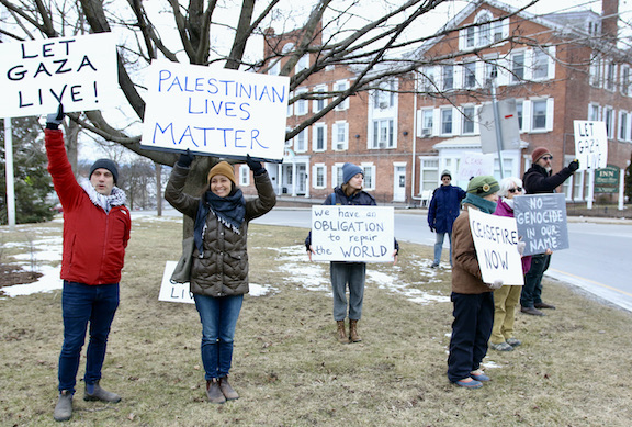 - Matt Orchard from Brandon gives passersby a message regarding the fighting in Gaza. The Australia native was part of a group demanding a ceasefire in Israel at a demonstration in Middlebury’s Court Square on Thursday afternoon. Independent photo/Steve James