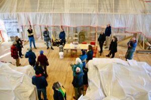 Visiting board members of the Preservation Trust of Vermont stand in front of the stage which is protected by plastic sheeting during renovation on tour-700w-rgb Feb 19, 2026 Share this story: