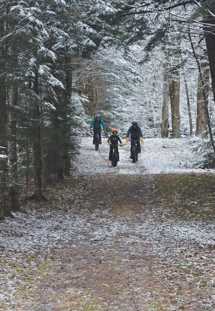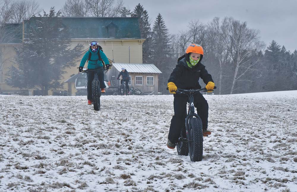 - MIKE AND SARAH Welch, with their 11-year-old son, Miles, all of Stowe, cruise on rented fat bikes along one of the trails in the Battel section of the Rikert Outdoor Center trails this past Sunday. Independent photo/Angelo Lynn