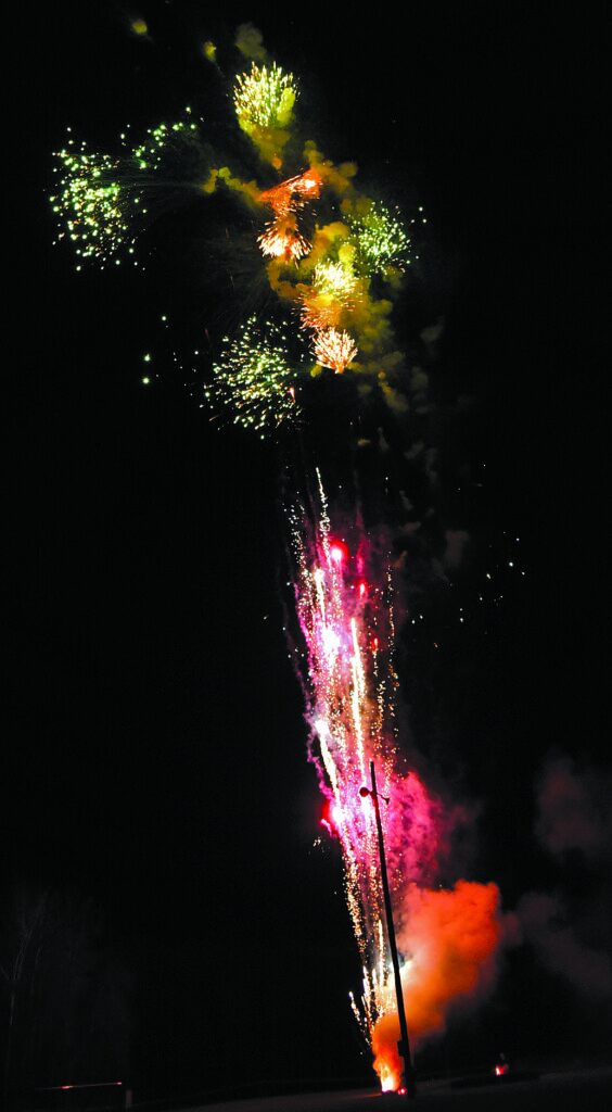 - SEVERAL HUNDRED PEOPLE attended Middlebury’s New Year’s Eve fireworks at the town recreational fields Sunday night to witness a dazzling display, with temps in the low 30s. Many then packed the Memorial Sports Center for a couple hours of free ice skating.Independent photo/Angelo Lynn