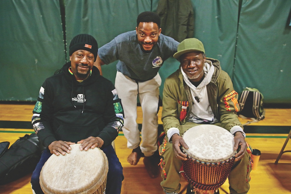 - THE JEH KULU ensemble, Ismael Bangoura, left, Seny Daffe and Assane Coly, at Mary Hogan Elementary School. Independent photo/Steve James