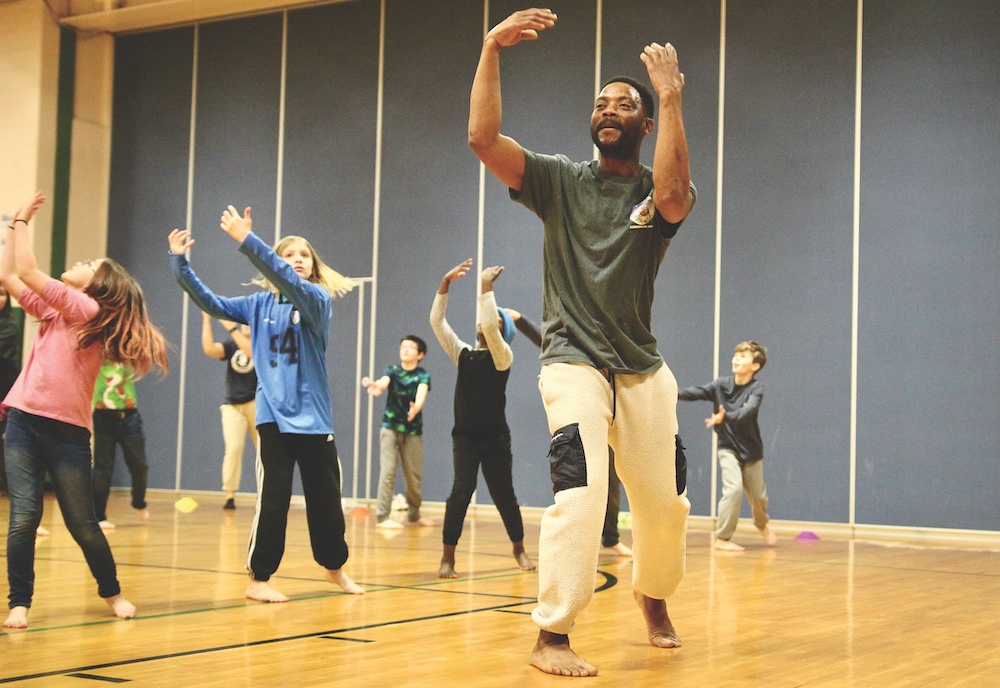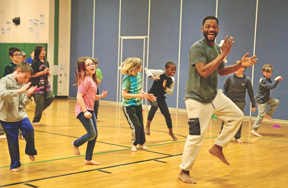 - SENY DAFFE OF the West African drumming & dance ensemble Jeh Kulu teaches Mary Hogan fourth-graders some new moves as part of a week-long residency at the Middlebury elementary school last week. Independent photo/Steve James