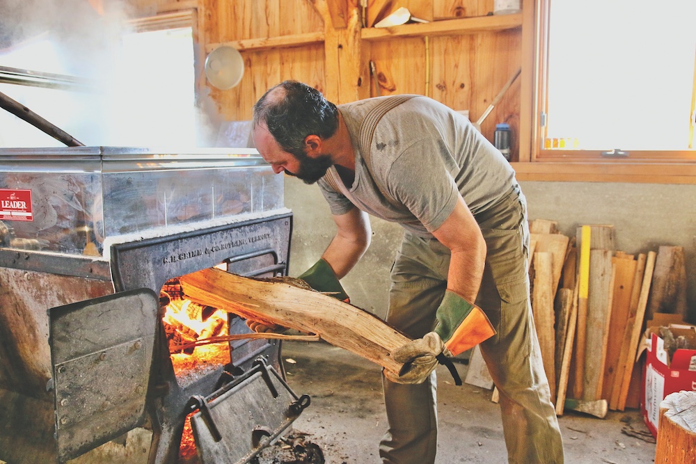 - SUGARMAKER WILL WERNER works up a sweat in his family’s Middlebury sugarhouse in mid-March while fueling the evaporator that was boiling his maple sap into golden, delicious maple syrup. Independent photo/Steve James