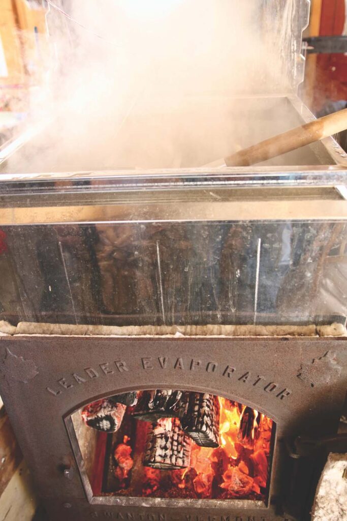 - MARK RAISHART FEEDS another piece of hardwood into the evaporator at the Foxglove Farm sugarhouse in Leicester on Sunday during Vermont Open Sugarhouse Weekend. He and his wife, Catie, boil up about 150-200 gallons of maple syrup each year. Independent photo/Steve James