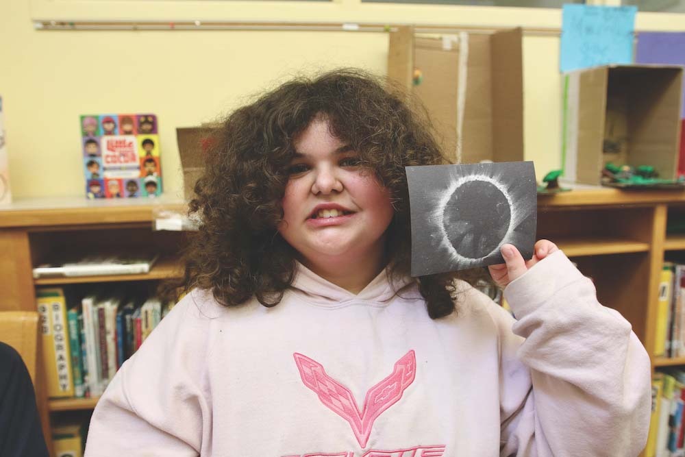 - FIELDING HENDRICKSON, A fourth-grader at Mary Hogan Elementary School in Middlebury, squints during a lesson eclipses last week as she tries to imagine what it will look like when the moon passes between the Earth and Sun on April 8. Independent photo/Steve James