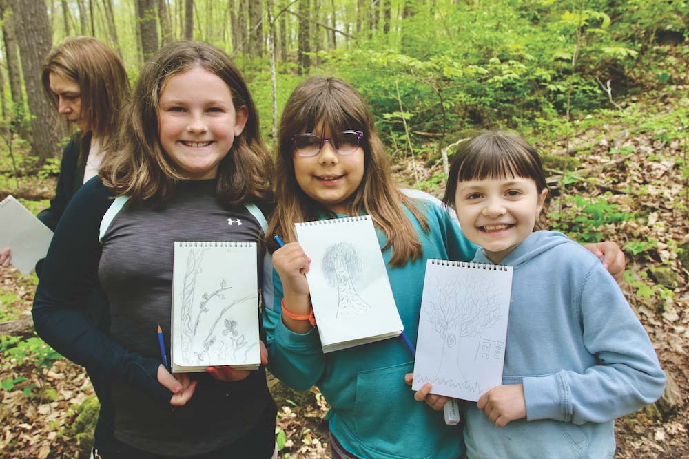 - BRIDPORT CENTRAL SCHOOL students Leone Plouffe, left, Emma Bordeleau and Nora Lilly are happy to share the nature drawings they produced during a plein air salon hosted by Middlebury artist Kate Gridley on the Tilley Trail in Weybridge this past week. Independent photo/Steve James
