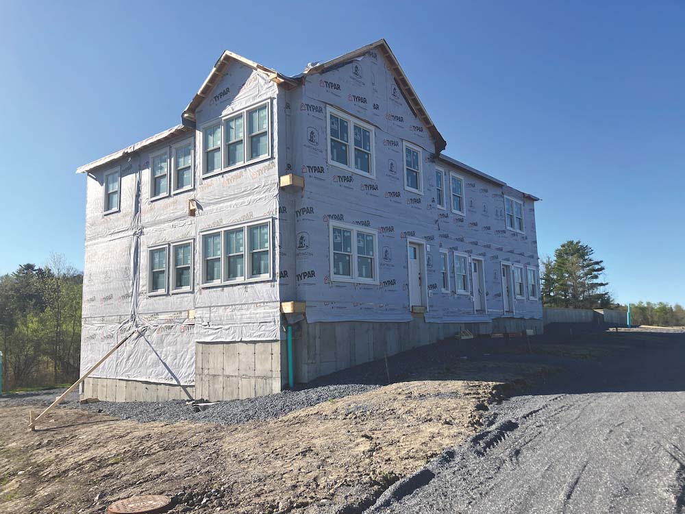 - BY FRIDAY AFTERNOON, several stories of the first house at Stonecrop Meadows were secured in place. Independent photo/John S. McCright