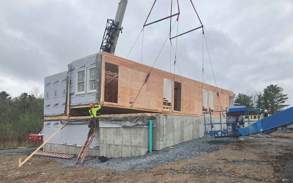 - A WORKER GUIDES a lowering prefab home on to its foundation this past Thursday in the new Stone Crop Meadows housing development that is going up off Seminary Street Extension in Middlebury. It was the first home to go up. Independent photo/John S. McCright