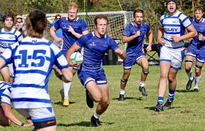 - Running on all cylinders MIDDLEBURY COLLEGE MEN’S rugby team dominated Colby on Saturday, winning a home contest, 31-12. It evened the Panthers’ season record at 2-2. Right, Middlebury Captain Thomas Maloney braces for impact early in the game, then, above, he sprints downfield in the second half on the way to scoring the Panthers’ fourth try of the competition. Middlebury will take on Providence College in Rhode Island this Saturday. Independent photos/Steve James