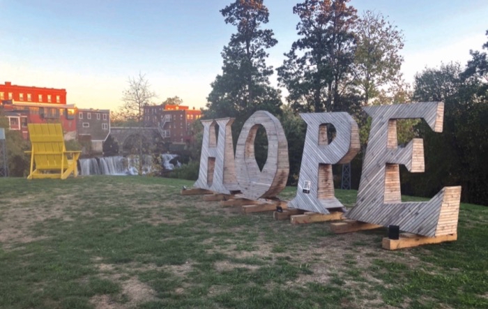 - MANY NOTICED THIS huge wooden sculpture that went up in Middlebury’s Riverfront Park just south of the Marble Works last week. The big message of optimism — 7 feet tall and 25 feet long — is the work of Jericho Center artist Chris Cleary. This sculpture, and others like it that say “LOVE,” “JOY” and “BE KIND,” are making stops around Vermont. It’s expected to stay for a couple weeks before being moved to a new spot. Check it out while you can. Independent photo/John S. McCright