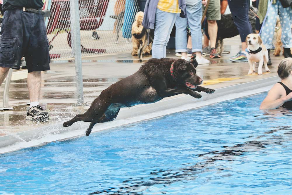 - ONE OF THE scores of dogs that took part in the Woofstock fundraiser for Homeward Bound on Saturday jumped into the Middlebury town pool before it closed for the season. Independent photos/Steve James