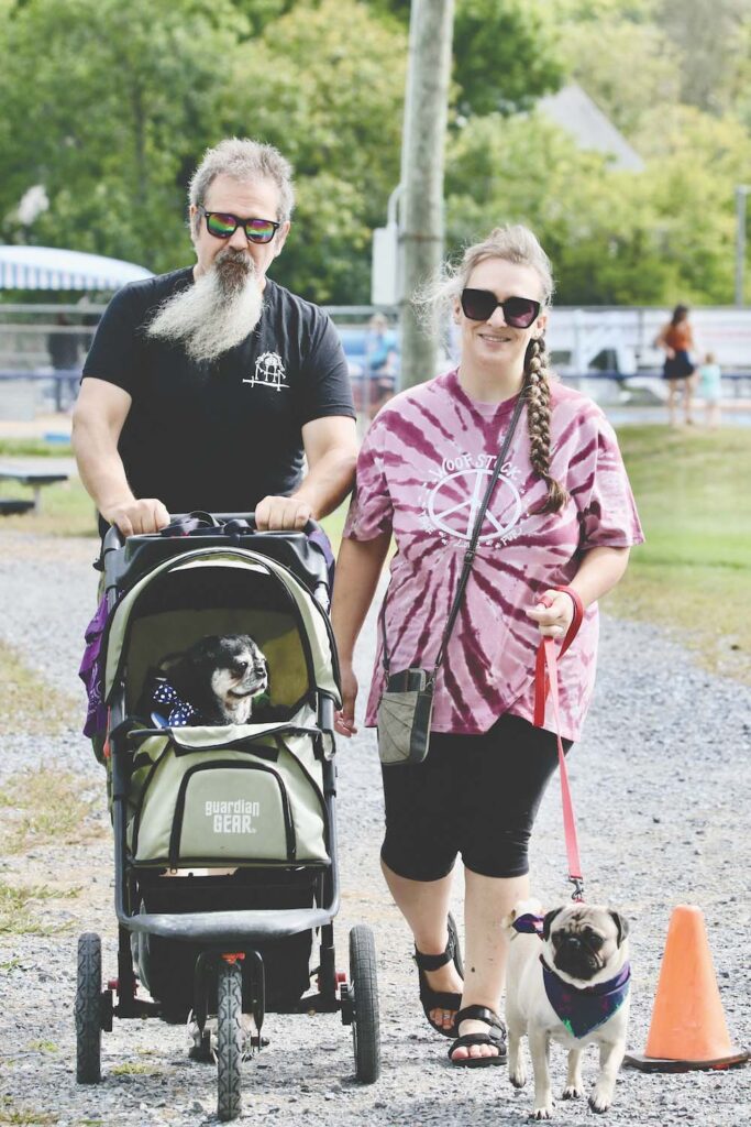 - A HAPPY DOG appears to be master of all she surveys as she gets pushed along during Homeward Bound’s Woofstock event in Middlebury on Saturday. Her puggish cousin bouncing along a few steps in front seems content in her own world. Independent photo/Steve James
