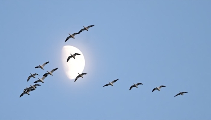 - AS IF THE beauty of snow geese flying in formation, their ink-tipped wings nearly touching, wasn’t lovely enough, a local photographer timed his shot to superimpose the migrating flock under the moon rising over the Champlain Valley this weekend. Photo by Lee Krohn