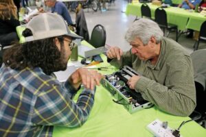 Repair fair Jon Deming tinkers with a DVD player brought in by Larry Montague Apr 26, 2024 Share this story: